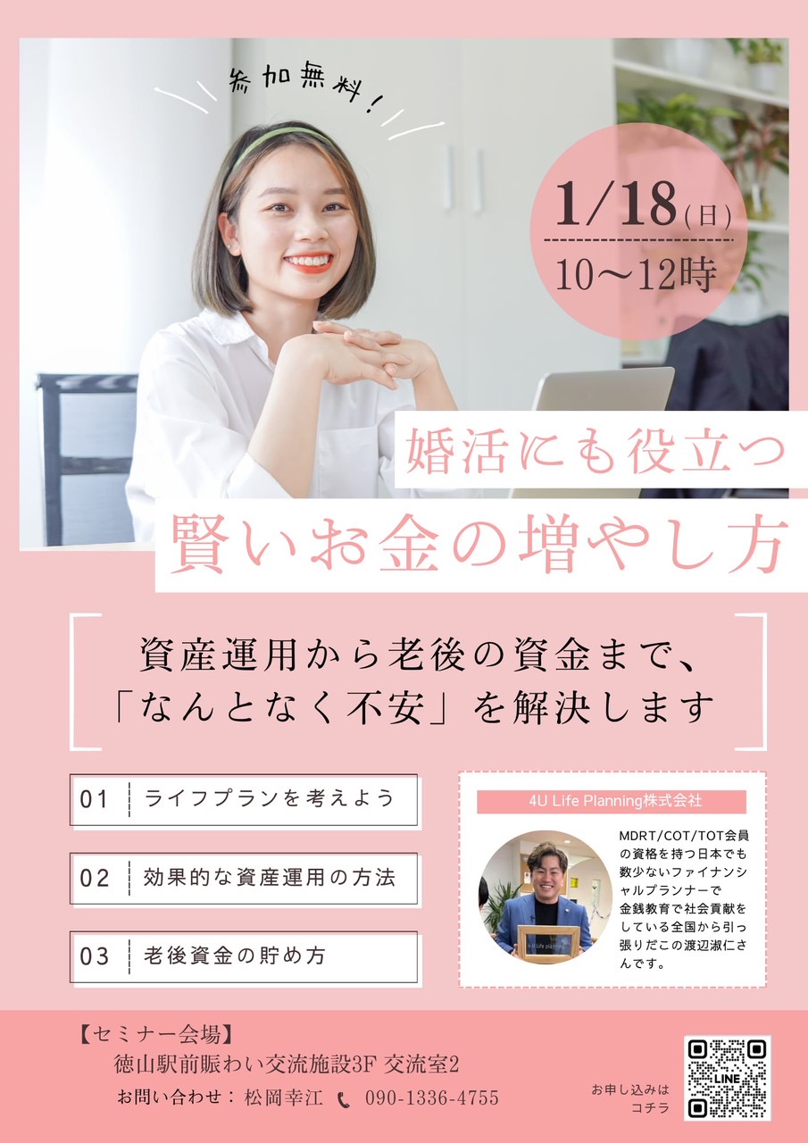 婚活にも役に立つ賢いお金の増やし方 来る1/18(日)10~12時 徳山駅前賑わい交流施設3階 交流室2 で 「婚活にも役に立つ賢いお金の増やし方」と題して …